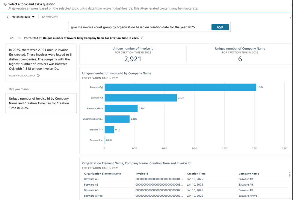 “Give invoice count grouped by organization based on creation time for the year 2025”