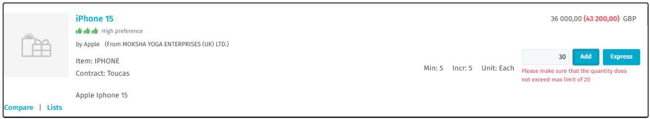 A new field “Maximum Order Quantity” has been added in agent agreement items. When set, users cannot order more than this quantity.If users try to add more than the allowed quantity to the basket, a validation message appears and blocks the item from being added to the basket. Similarly, if users update quantities beyond the limit after adding items to the basket, a validation message is shown and prevents checkout of the item from the basket until the quantity is adjusted to comply with the quantity limit.